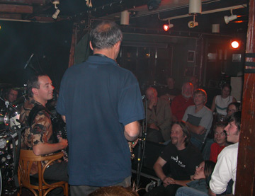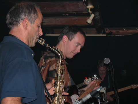 | Stian er ikke mindre fingernem på gitaren, her i tett race med Trifon Trifonov - | - som også kjørte en ubeskrivelig tolkning på "Ingemar Nordströms Saxparty" på to saxofoner - på én gang, selvfølgelig til publikums store begeistring. |