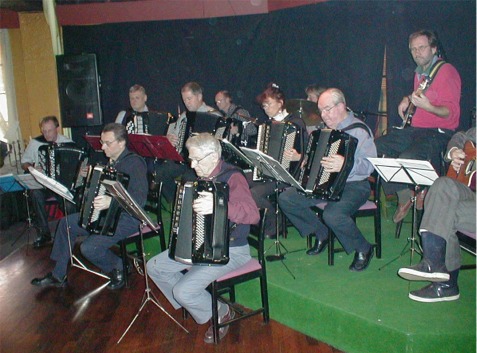 | © fo2:2re | "Christiania Trekkspillklubb" under musikalsk ledelse av Kjell Sponnich til venstre, opptrådte 3. november 2001. |