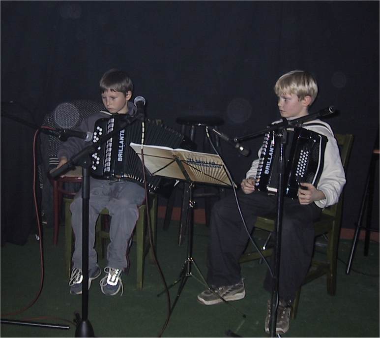 Kenneth Larsen (10) og Sindre Knutsson (12), Oslo, spilte både duetter og solo i pausen. De høstet stor applaus fra tilhørerne. (24.11.2001). De spilte også på kaféen den 15. desember 2001. |