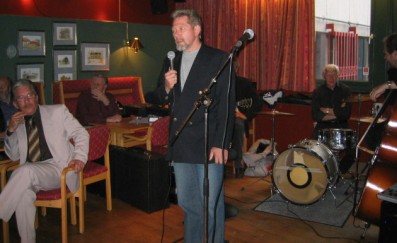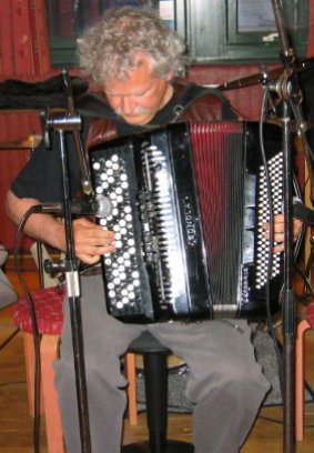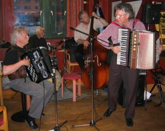 | Knut Lien, trekkspill med kveldens faste komp.: Bjørn Fredriksberg, kontrabass, Henry Slåtten, trommer, og Arne Bekk, gitar. Disse åpnet kveldens underholdning med en bukett fine evergreens. | Kveldens konferansier, Kjell Stensby, loset oss gjennom programmet og fortalte trekkspillhistorie. Han er "altetende" innen musikk, men liker best fransk trekkspillmusikk. Selv liker han for øvrig å spille viser av Prøysen, Taube og Vidar Sandbekk. |