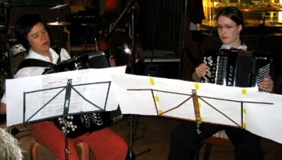| Einar Oppegård og Arnljot Budeng hadde en fin framføring av "Orfeum Intermezzo" av Chr. Liebakk, faktisk så bra at de måtte fremføre stykket 2 ganger etter ønske fra publikum. | Et klippe utøvere fra Elverum Trekkspillklubb som det svingte bra av. Reinlenderen "På Buball", komponert av Arvid Ottosen i 60-årene, tolket de meget bra. Komponisten var selv tilstede og høstet stor applaus fra publikum. |