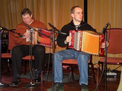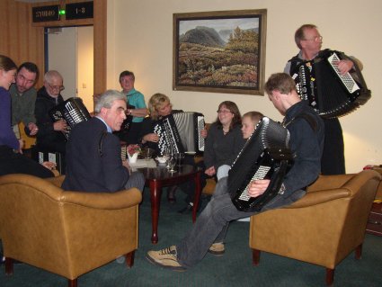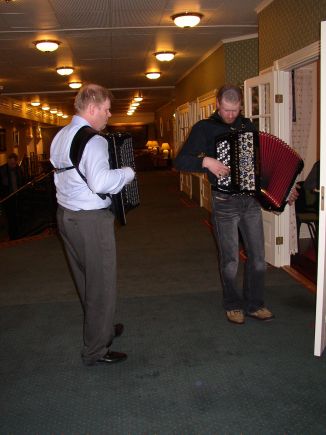 | Viktor Dukaltetenko (venstre) og Roar Knutsen var bl.a. med og akkompagnerte til Gudny Dahlens sang. | På hotellet var det musikk i hver en krok, slik som her hvor vi fant Knikt-laget fra Fron. |