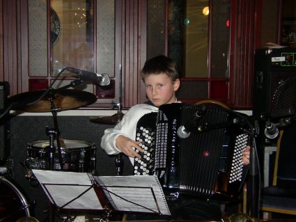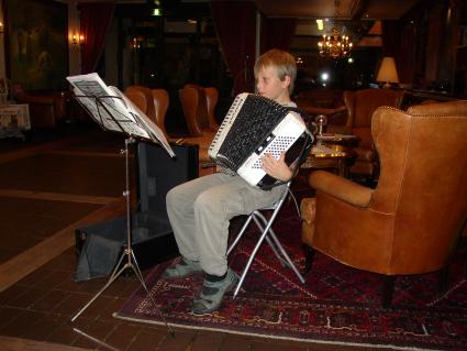 | Arrangementets desidert yngste deltaker, Roymond Olsen (10 år) fra Horten, åpnet konserten i baren på hotellet på lørdag slik han har gjort de 2 foregående år. | Kenneth Larsen (11 år) fra Oslo deltok på treffet for første gang, og stilte velvillig også på spilling under konserten. Vi håper å høre mer til disse unge herrer i fremtiden. |