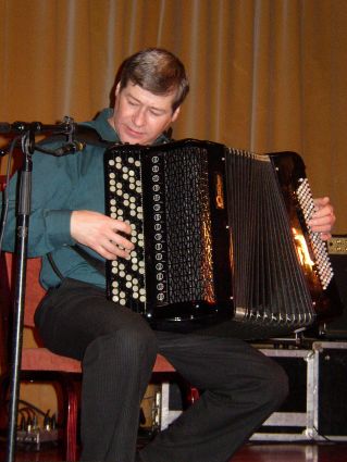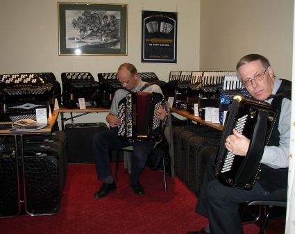 | 2RE-2NE-R2 3kkspilltroll ANS hadde stor trekkspillutstilling vis-a-vis Strandefjorden sal. Her var det muligheter for prøvespilling slik som disse deltakerne gjorde. | Roar Hensvold fra 2RE-2NE-R2 3kkspilltroll ANS (til venstre) og flere nysgjerrige tilhørere måtte ta "prøvespillingen" på gangen når trengselen ble for stor. |