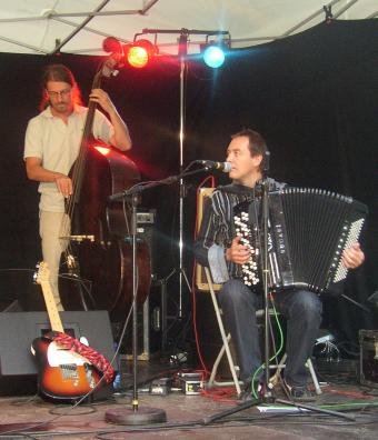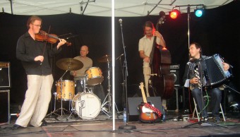 3kkspilltrollene tok seg en tur til Nilsson's café, som egentlig ikke var noen ordentlig café, men viste seg å være en "konstruert" utecafé med scene i en trivelig bakgård. Værgudene var tydeligvis på vår side etter å ha forsøkt å skremme oss med tordenskrall. Her kunne vi nyte en 2-timers konsert med "Stian Carstensen & venner". Trommeslager og bassist er "fast inventar" i Farmers Market. Ola Kvernberg har blitt anerkjent som en av landets beste jazz-fiolinister, og vi vet fra før at kombinasjonen Kvernberg-Carstensen med komp låter aldeles fortreffelig. Stians forkjærlighet til Balkan-musikk skinner igjennom på alle hans konserter, og det norske folk ser ut til å ha vendt seg til disse rytmene og taktartene som er langt fra 4/4-takt. Vi fikk smakebit på "Bulgarsk gammeldans i 11/16-takt" som startet med pols og endte med en kombinasjon av polka og sving. Uten stødig bassist og trommeslager hadde dette potpurriet med "ubemerkete" overganger vanskelig latt seg gjennomføre så glatt. Køntrijazz var kanskje ikke så gal betegnelse når Stian fant fram banjoen og Ola riktig fikk utfolde seg som solist på sin fiolin. Vi kunne nesten se for oss cowboyene på hesteryggen. Guttene har også sans for de virkelig jazzharmonier, og det var en nytelse å høre "Smile". Humor manglet det heller ikke på, og Stian fikk ene og alene lov å framføre Leif Justers nummer "Den tredje mann" med sang. Ønsker fra "salen" var det også mulig å få igjennom, og vi kan bare si at Køntrijazz-formen er kommet for å bli!