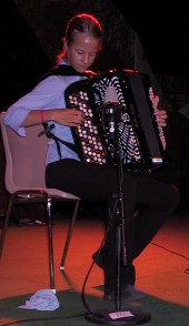 Kristin Gravaune (bildet) kom på andreplass både i denne klassen og i klassen for ”solo andre instrumenter, junior”, hvor hun spilte trekkspill. Det viste seg at flere gjorde som henne og stilte opp med både torader og trekkspill. Tom Berg er også en allsidig spillemann som trakterer både trekkspill og torader. Han vant klassen for ”solo durspill/torader, senior”. |