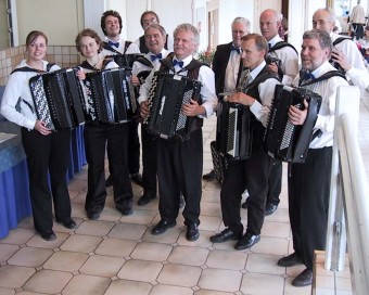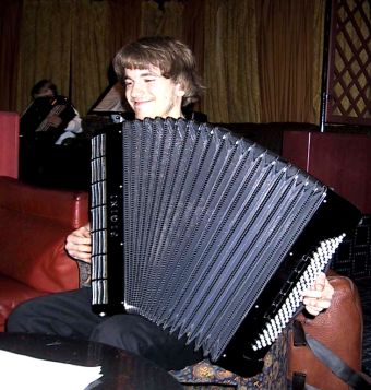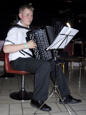 | Terje Brun (t.v.) kommer fra Lofoten, men er for tiden bosatt i København, der han studerer ved Det kongelige danske musikkonservatorium. Under NM deltok han sammen med Lofoten Trekkspillorkester og Flakstad Trekkspillklubb. | ||||||