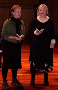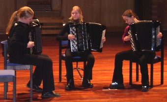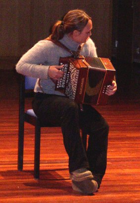 | Konserten åpnet med en trekkspillkvintett som så ble omgjort til en trekkspilltrio. | Liksalmen "Ver glad, mi saal" fremført i form av kveding hadde vel de færreste hørt. Åshild Vetrhus og Solbjørg Tveiten. Liksalmer karakteriseres ved at man har en forsanger hvor den andre "henger seg på". Effekten blir en ørliten forskyvning i takten hos "påhengerne". |