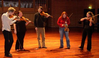 | Ellen Marie Selland hadde valgt en komposisjon av Vaclav Trojan fra 1960 som omhandlet den bomba katedralen i Dresden. Et riktig mollstemt stykke. | Gehørspill er et eget fag ved folkemusikkstudiet på NMH. Gruppen og deres lærer ga oss eksempler på to slåtter. |