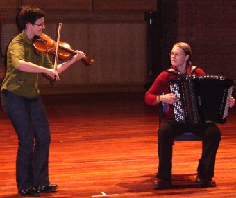 | Jorunn Marie Rypdal Kvernberg og Ragnhild Furebotten på fele. Begge er også med i Majorstuen spelemannslag. | Mange komposisjoner er i utgangspunktet skrevet for andre instrumenter enn trekkspill. Heidi Sandvik fremførte således utdraget Malagueña fra den spanske suiten, Andalucia, som opprinnelig er skrevet for klaver. |