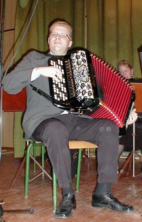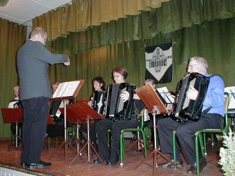 | Modum Trekkspillklubb hadde også lang reisevei. De dirigeres her av Håvard Svendsrud. | Håvard Svendsrud spiller også selv i orkesteret. |