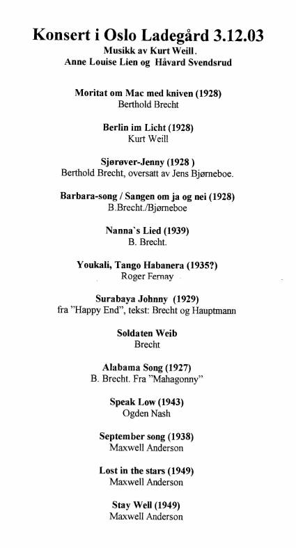 Kurt Weill (1900-1950) vokste opp i en av de eldste jødiske familier i Dessau. Spesielt hans siste komposisjoner dreier som om jødisk musikk, men det er musikken komponert i perioden 1925-1928 han ble mest berømt for. Dette trolig fordi han da hadde sin mest lykkelige periode etter å ha giftet seg i 1924. "Berlin im Licht” (1928) handler om hva man trenger for å belyse hva som virkelig skjer i en by. I 1933 fikk han en anonym advarsel om å flykte, da nazistene ikke var særlig begeistret for hans virksomhet som ofte førte til opptøyer der musikken ble fremført. Mange har spurt seg om han solgte seg til kommersialismen. Uansett var han meget engasjert i samfunnsspørsmål som f.eks. apartheid, og i "Surabaya Johnny” (1929) tar han for seg triste kvinneskjebner. Han flyktet omsider til Paris, deretter til London for så å havne i New York. Da han kom til N.Y. i 1935 begynte han en ny karriere ved å skrive musikk til Broadway-musicals og amerikansk filmmusikk. De kjente melodiene "Speak Low", "September Song" og "Lost in the Stars" var alle med i kveldens repertoar. Kurt Weill komponerte "krevende" musikk, og med utgangspunkt i kun orkesterarrangementer synes vi Svendsrud gjorde maksimalt ut av disse på trekkspill, samt at akkompagnementet støttet fint oppunder Liens sang.