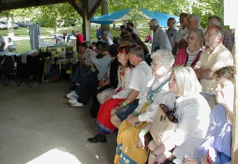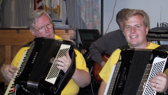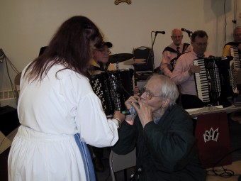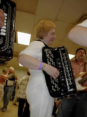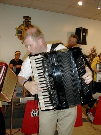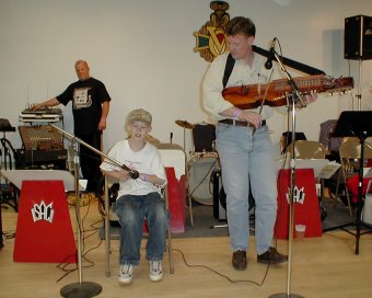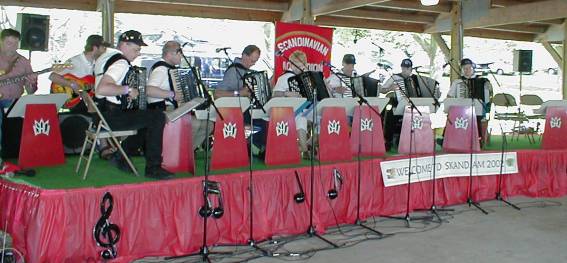 | Ellen Lindström fra SAC (Skandinavian Accordeon Club of New York) hadde ansvaret for lyden. | Peter Hedlund fra Sverige på nykkelharpa akkopagnert av sin sønn, Jonas, på skjeer. |
