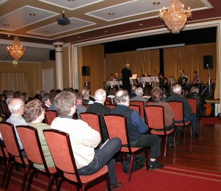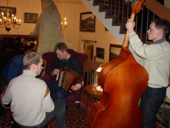 | Det var tydeligvis ikke nok scener på hotellet. Her i hotellets vestibyle hvor det var bare å slippe seg løs. | Tom Kjetil Tørstads orkester "tørrtrente" også med buskspill i hotellgangen. |