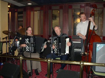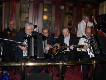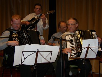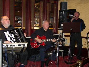 Olav Aunan (t.v.), Nils Johansen (begge trekkspill) og Kjell Antonsen på gitar.Disse serverte oss jazzrytmer. |