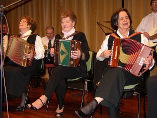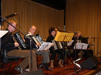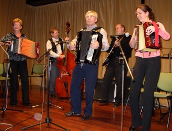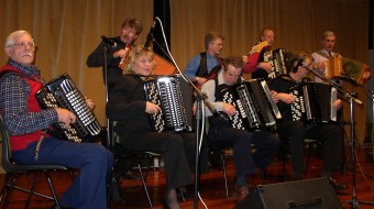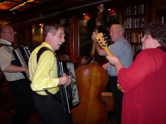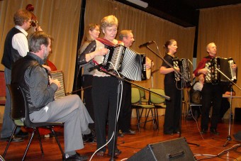 | Birger Østby (t.v.) hadde komponert en egen vals til ære for "treffgeneral" Synnøve Fjeld - "Synnøves vals". | Paul Maurud (trekkspill) og gjengen "Pauls" er stadig vekk å høre på Fagernestreffene. |