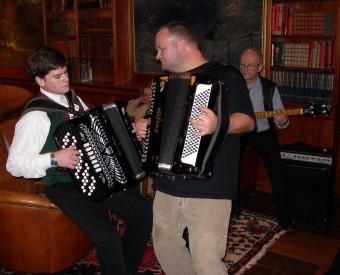 | Pål S. og Yngvar S. på trekkspill er også med i Halden TK. | Øivind fra Wescopen TK i Østfold (t.v.) og Lars Gundersen testet også akustikken i hotellets vestibyle. |