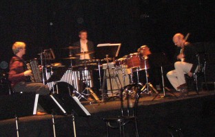 | Frode Haltli synlig fornøyd med sin framføring av Arne Nordheims "Flashing". | F.v. Frode Haltli (akkordeon) fikk god hjelp av Erik Raude (slagverk) og Thomas Kjekstad (el-gitar). |