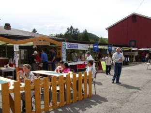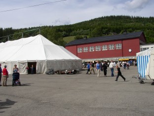 | Teltet i skolegården der bl.a. premieutdelingen foregikk. | "Verrandagan"s salgsboder i skolegården. |