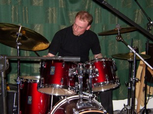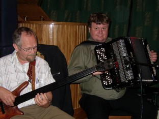 | Jazzkroa i "Flage" var godt besøkt. Ove Liff (t.h.) medvirket og som dommer for gammeldans-klassene. | Årets "NM-trommis" Kaj Endresen og fikk jammen en velfortjent pris også. |
