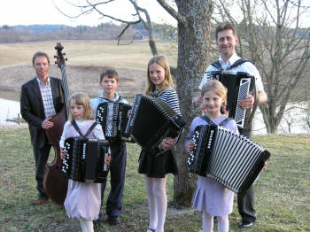 | "Oskar og Kajas kvartett". Fra v.: Arman Guthushagen (bass), Ella Guthushagen (8), Oskar Guthushagen (11), Kaja Ringerike (11), Ina Ringerike (8 1/2) og Erik Ringerike. | Store og små musikere falt for fristelsen til buskspill - eller skal vi heller si "fjøsspill"...... ;-)) |