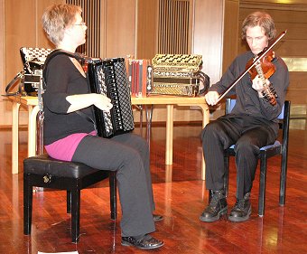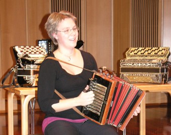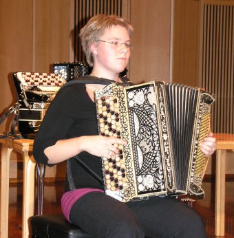 Ingunn benyttet også torader på konserten, men brukte kun den ytterste raden som en enrader. Hun spilte en ”laus” etter Eirik Thoresgard og demonstrerte hvordan det i eldre dager var vanlig å spille med ”liggende bass” i kompsiden. Temaet gjentas også ofte i det uendelige i eldre springare. |