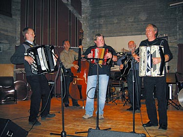 Lågdalsmuseet, som vartet opp med en utrolig fin sal i nesten ren betong ispedd litt furu. Høres ikke så fint ut? Joda, det er sjelden å se en finere sal. Den satte rammen rundt et vellykket og innholdsrikt arrangement. Først konsert og deretter dans. Tonen ble slått an av arrangørklubbens hovedorkester - det er nemlig et yrende trekkspillmiljø på Kongsberg. I tillegg til klubben stilte Kongsberg med 4 lag til! Alle var av høy kvalitet og ikke minst med et variert innhold. En stor og allsidig klubb som skal ha ros for gjestfrihet og fin musikk. Publikum hadde gleden av å få en serie godbiter servert. Ringerike TK, Strømmen TK, Modum TK, Drammen TK, Moss TK, Halden TK og Eiker trekkspillgruppe sørget for melodier i et rikt utvalg taktarter. Innimellom ble det løst opp på en fin måte av mindre grupper fra arrangørklubben som har mange unge dyktige medlemmer. |