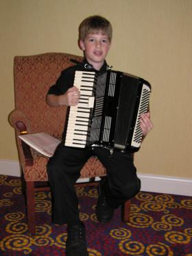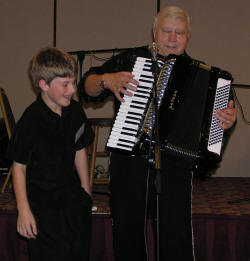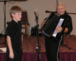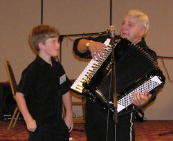 Det Frank Marocco ikke fikk formidlet hva angikk belgbruk, tok Tony Lovello - ”Liberace of the Accordion”- seg av. Han har også passert de 70, og har en noe annen tilnæringsmåte til trekkspillet og spillestil. Det å ha blitt kåret til ”kongen av belgristing” av selveste Anthony Galla-Rini forteller det meste. Tony liker nærkontakt med publikum og vandrer gjerne spillende ned mellom benkeradene. Det ble trolig en uforglemmelig seanse for 9 år gamle Cole Canfield fra Ormond Beach. Han har spilt siden han var 6, men har savnet et miljø med trekkspill. Dessverre fant han ingen jevnaldrende på SMASHen, men fikk et plaster på såret da Tony tok han med seg opp på scenen med litt show og moroskap. Cole var senere på kvelden med på ”buskpillet” i baren, og viste gladelig hva han har lært på trekkspillet sitt. |