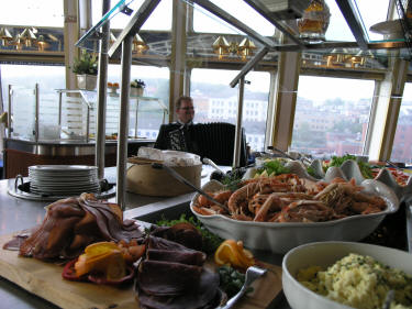 | Håvard Svendsrud - engasjert som taffelmusiker (du ser ham bak rekebollen ;-)) | Christiania Trekkspillklubb (CTK) var med på cruiset for å feire sitt 30 års-jubileum. |
