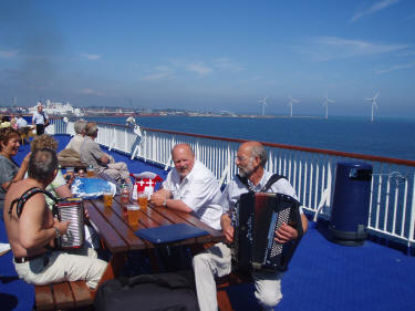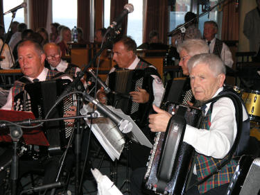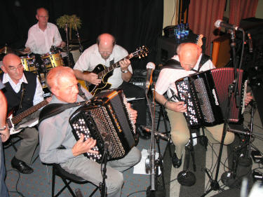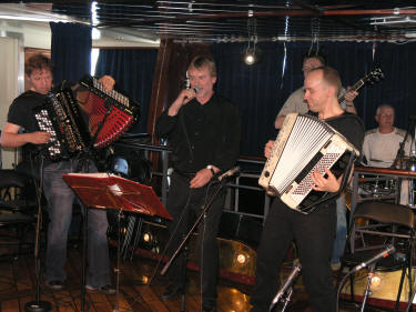 Trekkspillveteranene fra Oslo holder det også imponerende nok gående. Her ser man levende bevis på at alderen i alle fall ikke er til hinder for musikalsk deltakelse, og i orkesteret finnes også Arnstein Johansen som like godt fant ut han kunne feire sin 80 års-dag ombord på "Peter Wessel" som noe annet sted. Han kunne vanskelig unngå mye oppmerksomhet i denne anledning. Blant ”buskspillerne” i kafeen, fant vi bl.a. "Hauglands orkester" som fremførte melodier fra Arnstein Johansens repertoar og også flere av hans egne komposisjoner. |