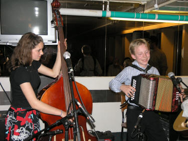 | Et friskt pust fra Eidsvoll - Vegard Storbråten Øye (13) fra Eidsvold med Marianne (14) på bass. Begge er aktivt med Steinsgårdskroken Spell og Danselag, Hurdal. | Flere friske pust fra "Flyskrekk Orkester" - et av Norges bedre gammeldansorkestre. |