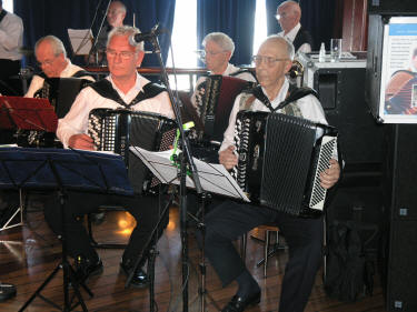 | "Trekkspillveteranene", med Arnstein Johansen (t.v.), ga en times lang konsert i forbindelse med feiring av nevnte 80 års-jubilant. | Flere av "Trekkspillveteranene" med leder Alf Blyverket foran til høyre. |