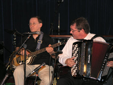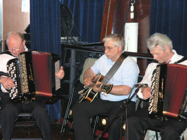 | En etterlengtet gjenforening av "Nordkappkvintetten" med desidert lengst reisevei skjedde ombord under konserten i "Dynekilen". På trekkspill f.v.: Karstein Pettersen og broren Bjørnar Pettersen. | Den tredje trekkspilleren i "Nordkappkvintetten" trenger knapt presenteres - Kjell Harald Langhaug. Han hadde også sin egen soloavdeling før gruppas opptreden. |