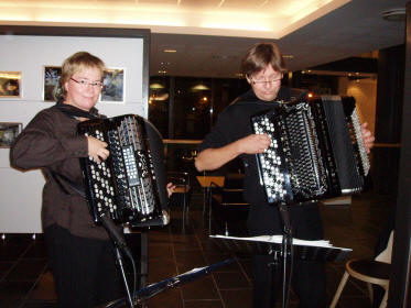 | Bente Midtsveen og Frank Andresen sørget for "taffelmusikk" under mottakelsen i Asker Kulturhus for utøvere, dommere og andre involverte |