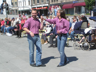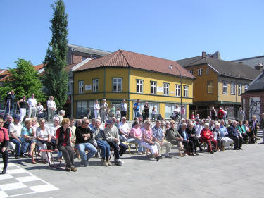 | Etter endt spilleøkt svingte noen av "Mossingene" seg etter fengende swingrytmer fra Einar Sandviks kvartett. | I tilfelle regnvær hadde i alle fall musikerne sittet tørt, men det spørs vel om benkene hadde vært tomme. |