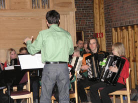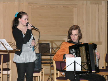 MSK stod som arrangører. Heidi Olsen Kiss leder MSK sammen med Otto Kiss, og er forøvrig med i Oslo Trekkspillklubb (OTK) som var invitert til å åpne konserten. Dirigent Erik Bergene hadde arrangert både den lystige ”Grainger Suite” i tre satser som er basert på britisk folkemusikk og ”Iddisch Wedding Dance”. Fra glad jødisk musikk bar det rett over til ”Budeiene på Vikafjell” av Sjur Helgeland. Helga Guren brukte hardingfela for å få fram kulokking til fjells, men gikk så over til sangmikrofonen for å formidle kjærlighetssorgen mellom kong David og Batseba som skildres i L. Cohens ”Hallelujah” – et krevende nummer som spenner over flere oktaver. Vidar Stenseth stilte sporty opp på gitar for å akkompagnere Helga, og ryktene sier at de på forhånd hadde fått øvd opptil flere minutter sammen. |
