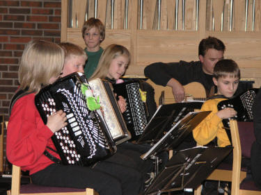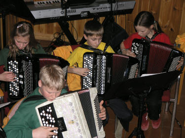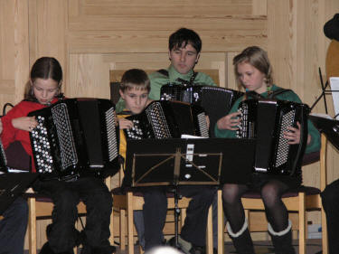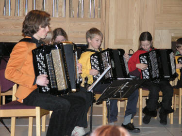 Og endelig var det selve arrangørenes tur der de minste elevene er med i MSKs rekruttorkester. Per Emil Grimstad har nylig overtatt lederoppgaven for rekruttene, og de fremførte to av hans egne komposisjoner ”Rekrutt” – en tango basert på ”Hvem kan segla” og ”Prompepolka”. Under fremføringen av S. Bjørstads ”Walt Disney Music” med hjelp av Sofie på sang, gikk tankene tilbake til fjernsynets Disney-julekavalkade før parabolantennens fødsel. De avsluttet som tidligere nevnt med ”Tico Tico”, og vi regner med at mulige tilstedeværende representanter fra menighetsrådet allerede for lengst har tilgitt både påkallelse av heksedoktorer og sambadans. |