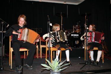 | Elever ved den kommunale musikkskolen deltok på konserten | Andres Nibstads barnebarn i aksjon under konserten: Andreas, Simen og Fredrik |