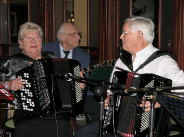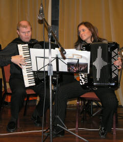 | Gerd og Aage Thuen i Halden Trekkspillkvartett. Frank Thomassen bak på gitar. | Yngvar Strøm og Mari Amundsen - med i Halden TK, Halden Trekkspillkvartett og "Marinetta". |