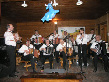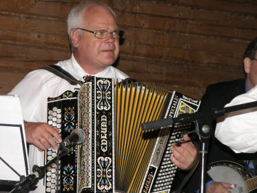 | Initiativtaker Pelle Edlund, ikledd slips dekorert med kuer, er å finne både i Strømmen Trekkspillklubb og i ”Etter fjøstid” og var ikke helt sikker på om dette er 12. eller 14. gang. Det at man har kommet ut av tellinga er uten betydning når interessen for treffet stadig er stigende. Med god orden og styring på spillelista, gikk sceneskiftene mellom årets 14 inviterte grupper fint etter planen, mens de 5 gruppene som stod på venteliste, var det dessverre ingen mulighet til å presse inn. |
