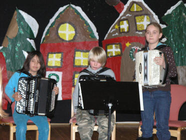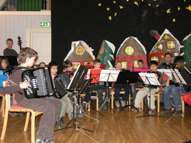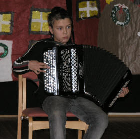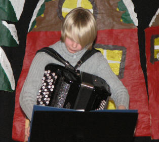 Etter å ha skummet fort igjennom det innholdsrike to siders programmet, tenkte vi at muligens måtte natten tilbringes her også, men trekkspillærerne og arrangørene Brit Laila Ouff og Anders Grøthe er vant til å håndtere barn, og sceneskiftene gikk utrolig glatt. De presiserte at denne gangen skulle alle som ønsket å spille på konserten få anledning. Første avdeling var avsatt til solister og duetter. For flere av de minste var dette deres ”debut”-konsert, og man kan selv tenke seg til hva som skal til av mot når en 4-5 åring har 50 par øyne stirrende på seg. Noen syntes det var trygt å ha læreren der med litt bistand når det ble for skummelt, deriblant vesle Anna Ouff Grøthe som fremførte ”Så går vi rundt om en enebærbusk” i duett med pappa Anders. Litt adrenalin kan være spennende for de minste også, og de fleste strålte på vei ned fra scenen – tydelig fornøyd med sin egen prestasjon, noe vi klart må si oss enig i. |