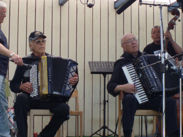 | Halden Trekkspillklubb tok dagens øvelse utendørs | Allan Levin (t.v.) og Roy Enger med trekkspillkos i sola |