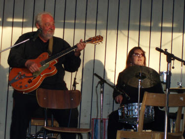 | Treffgeneral Frank Kjell Andresen - litt sliten etter mye forberedelser... | ....men med musikk går alt så mye lettere! Linda Johansen på trommer (datter av Nils Johansen) |