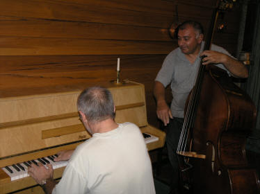 | Roy Enger og Harald Rudi med litt fransk under konserten på lørdag. | Musikkinteressen ble også vekket blant kjøkkenpersonalet. Kokken hadde nesten tårer i øynene da han for første gang på tolv år fikk låne en kontrabass og kompet taffelmusikkpianisten i spisesalen. |