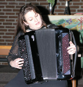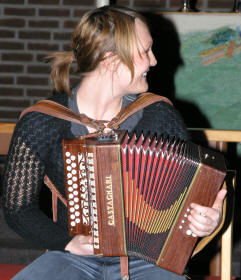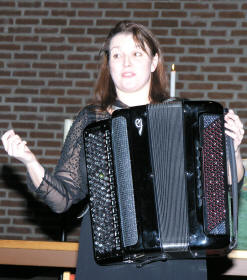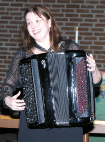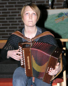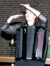 Kveldens siste artist, trodde vi, var Lena Rist-Larsen. Hun er utdannet både på fiolin og trekkspill fra Norges Musikkhøgskole, og debuterte i Aulaen i Oslo på trekkspill i 1996. Lena har hatt et allsidig frilansliv, og våren 2007 er hun engasjert som trekkspiller ved Oslo Nye Teater i ”Spellemann på taket”. Hun startet med å spille fransk barokkmusikk – ”3 bagateller” (Den skremte sissiken, Sivene og Vindmøllene). Deretter hoppet hun flere 100 år frem i tid. ”Ved bredden av det evige sekund” skrevet til trekkspilleren Geir Draugsvolds debutkonsert av M. Åm, trengte litt forklaring av Lena før hun satte i gang. Vi tenkte at med 3 ulike rytmer gående oppå hverandre og hvor man ikke finner eneren i taktslaget, måtte dette bli vanskelig å forstå, men Lena fremførte det på en elegant og fasinerende måte. |