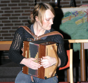 | Det virket med ett litt tomt etter de mange Trekkspillveteranene, da det stod kun én enslig stol foran alteret. Den var tiltenkt neste artist – Mona Holm fra Sørskogbygda på Elverum. Men da konferansier Frank Andresen leste opp denne toraderjentas rikholdige merittliste med bl.a. verdensmestertittel i Tyrol fra 2003 og 9 gull i NM, visste vi jo fra før at hun klarer å fylle ethvert rom som måtte virke tomt helt opp til randen med sin store musikk på et lite instrument. |