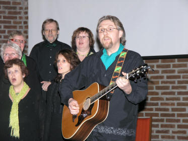 Pausene blir vanligvis ikke nevnt, men på Stovner-konsertene er disse en viktig del av helhetsopplevelsen. Vi observerte at praten som vanlig gikk livlig, og at mange gjerne skulle ha vekslet flere ord idet tiden var inne for igjen å finne plassene før Rælingen Sanglag var klar med sin avdeling. Dette er det eldste koret i kommunen og dirigeres av Kari N. Bernhoft. De teller i snitt 30 stk. og kom forøvrig rett fra seminar. De virket i alle fall langt fra lei av sangen i så måte og framførte både madrigalen ”Fair Phyllis I saw” og Shakespearetekster. Pop-hjørnet ble også løftet på med ”Can’t buy med love” og ”Wonderful tonight”. De påsto også de syntes det var litt dristig å bevege seg på folkemusikkgrunn ettersom det var så mange trekkspillere til stede, men de kom da fint igjennom både ”Dalakopen”, ”Pål sine hønur” og ”Astri, mi Astri”. ”Halleluja” av Leonard Cohen ble fremført til slutt med Geir Finnstun på gitar. |