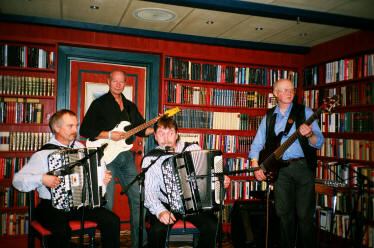 Så var dansen i gang igjen, men før den tok til, fekk vi ei koseleg økt med gruppa Sprell i salongen. Akustisk framføring og du som dei kunne spele. Førsteplassen på Landsfestivalen 2008 var nok fortjent. To trekkspel og med fiolin på topp, samt bass + gitar - alle dyktige på sine instrument. Kanskje ikkje rett å framheve nokon spesielt, men karen med fiolinen hadde i alle fall det som skulle til for å ligge åleine på topp med melodilinja.
