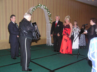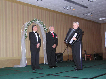 Antonio Barberena had several duties that evening. Totally impassive Karen Adam introduced all the artists as she always does. Shortly after the 2007 SMASH, Karen announced that she intended marrying the accordionist Walter Kasprzyk (well known as a member of the famous “K” Trio). Antonio quickly had to change into his tuxedo to be Walters best man. Tony Lovello was the music maestro and Karens 9 year old student, Jamie, was the ring bearer. After the wedding ceremony everyone went straight over to the Front Street Cafe to cut the accordion shaped cake and dance the wedding waltz. The party continued into the wee small hours. |