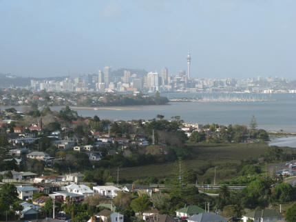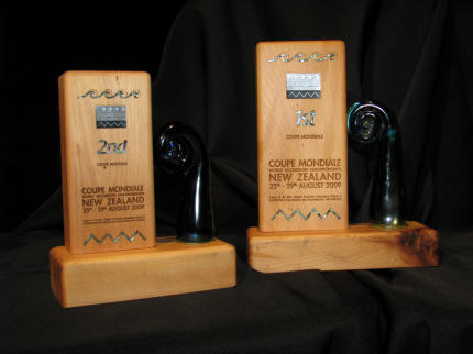 | Utsikt over til Sky Tower downtown Auckland fra hotellrommet på Takapuna, North Shore | Prisene for 1., 2. og 3. plass i hver klasse var en statuett laget i eldgammelt kauri-tre fra New Zealand |